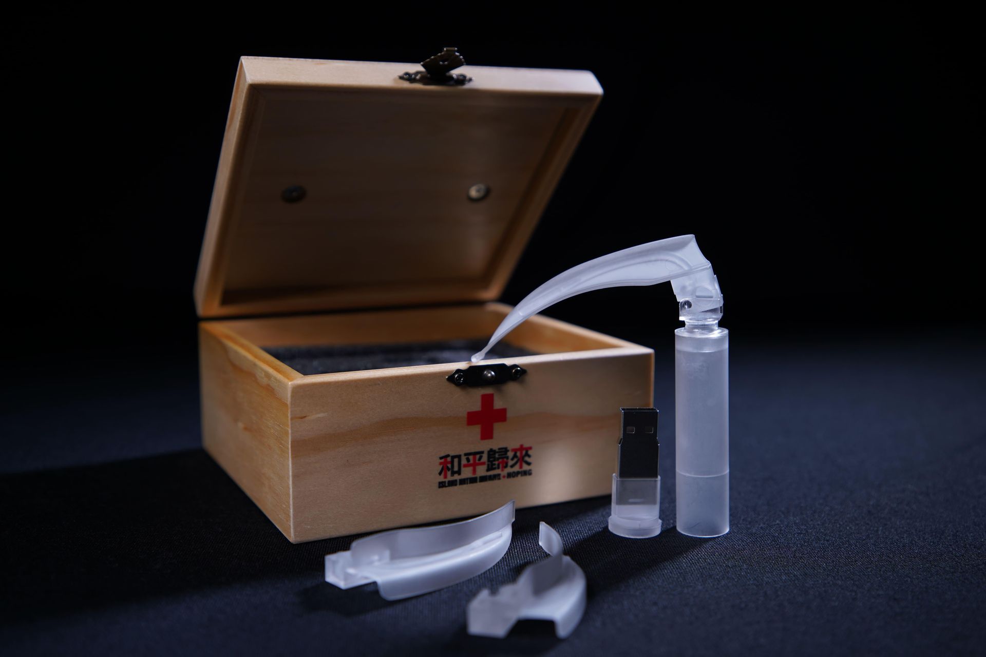 以喉頭鏡開模製作,底座為USB且內含4K版本和平歸來全集影片。